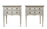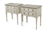 with decorative painted faux marble tops and two drawers in each with delicate bow design escutcheons. These commodes would be perfect as bedside cabinets.