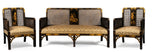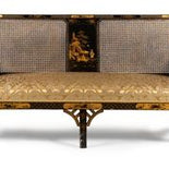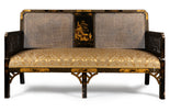 • SOLD An exceptional black Chinoiserie lacquer and caned bergere three piece suite English Circa 1920